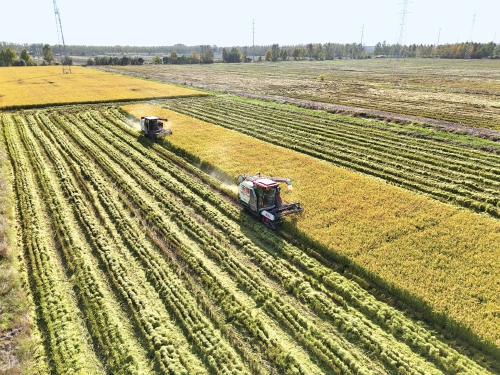 近日,在江蘇省連云港市海州區江蘇農墾崗埠農場的高標準農田里,職工們利用晴好天氣,積極開展水稻搶收工作,確保不誤農時、顆粒歸倉。  徐衛 攝